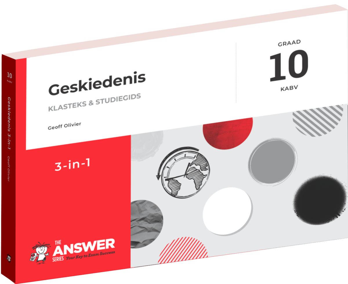 Hierdie Graad 10 Geskiedenis 3-in-1 studiegids bied ‘n omvattende beskouing van al 6 onderwerpe in die KABV-kurrikulum. Dit maak die vakinhoud makliker verteerbaar met nuttige foto’s, uittreksels, verduidelikings van sleutelterme en tydlyne.