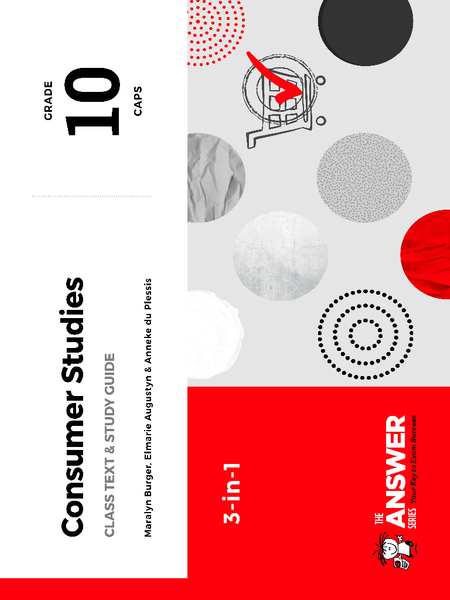 This Grade 10 Consumer Studies 3in1 study guide gives you a step-by-step but thorough introduction to the Grade 10 CAPS curriculum. The detailed notes, practical tips, generous array of questions, answers and exam paper practice provide the Grade 10 learner with all the skills, content material and consolidation necessary to excel in this subject.